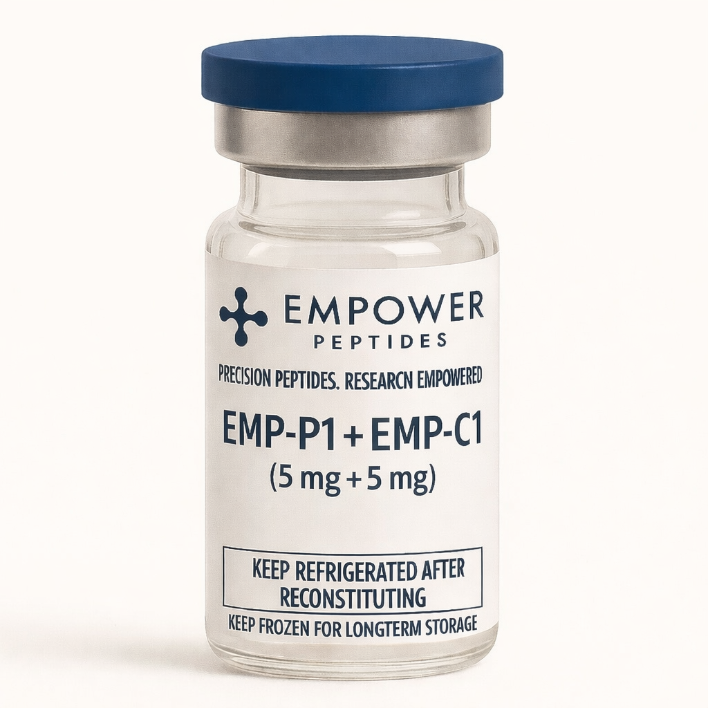 EMP-P1 + EMP-C1 is a dual-component laboratory research peptide pairing supplied for use in controlled, non-clinical experimental environments. This paired formulation is intended for analytical and exploratory research applications involving molecular characterization, stability observation, and experimental response evaluation within defined laboratory models. Supplied as a lyophilized powder, this material supports precise handling and consistent experimental setup.