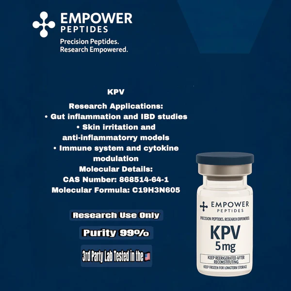 KPV is a synthetic tripeptide fragment commonly utilized in laboratory research to investigate peptide–receptor signaling pathways and cellular regulatory mechanisms. It is frequently examined in controlled models assessing epithelial integrity, cytokine pathway signaling, and melanocortin-related biochemical interactions.