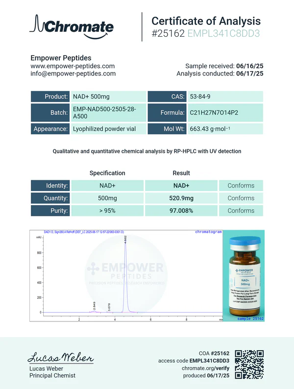 NAD+ is an essential biochemical cofactor widely examined in research involving cellular energy pathways, redox reactions, and enzymatic mechanisms. In laboratory models, NAD+ supports investigations into oxidative metabolism, electron transfer reactions, and cofactor-dependent biochemical signaling pathways.