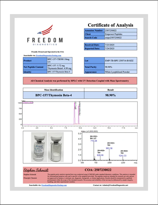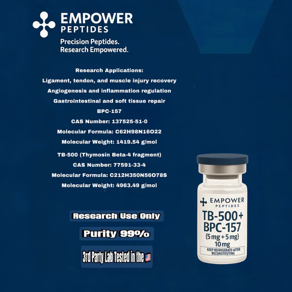 This dual peptide formulation combines TB-500 and BPC-157, two peptides frequently examined in laboratory environments for research involving cellular signaling pathways, peptide-mediated response mechanisms, and structural protein interaction models. The blend provides researchers with a consolidated option for studying multi-pathway signaling dynamics and peptide interaction behavior within controlled experimental systems.